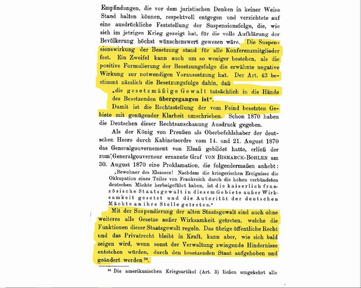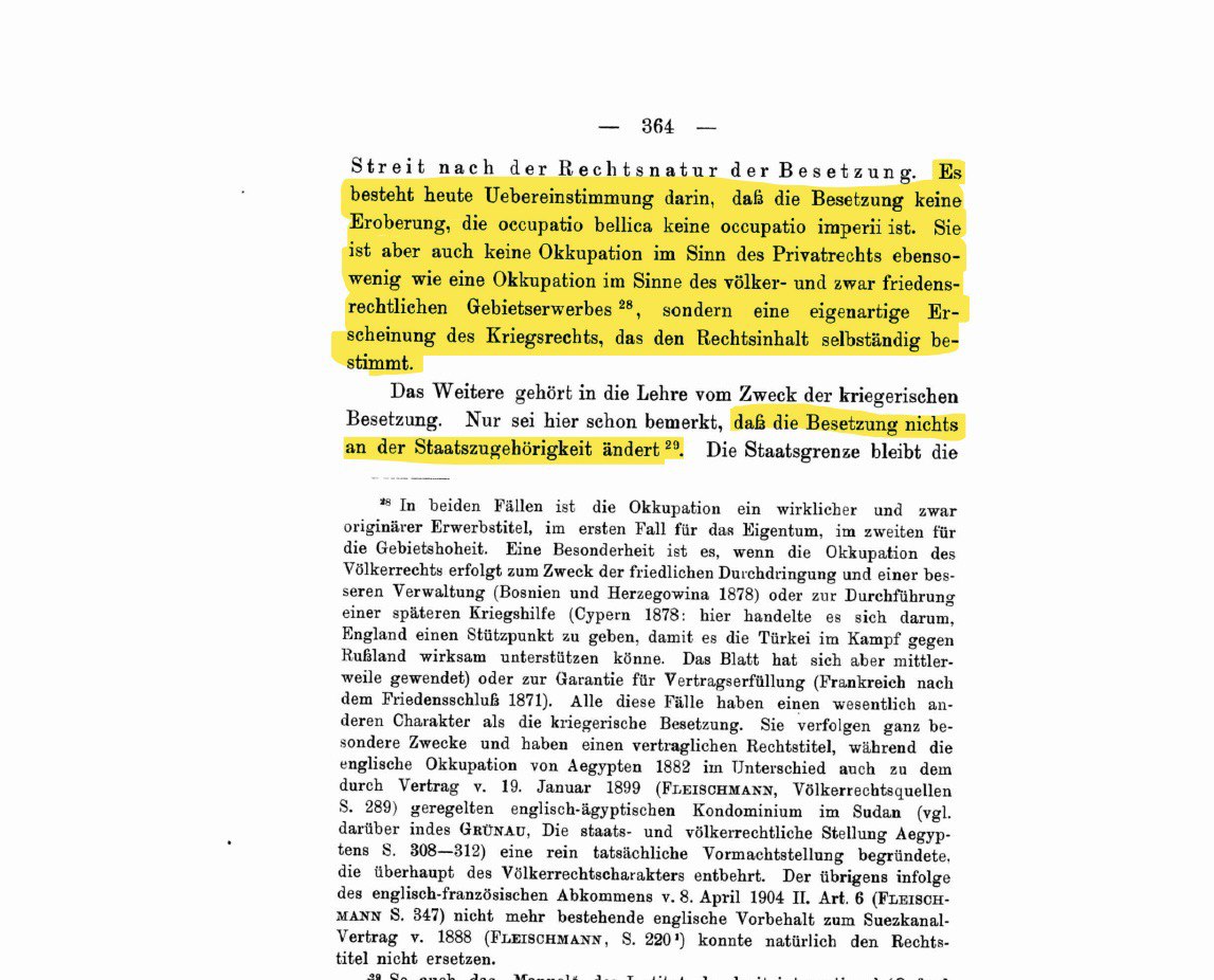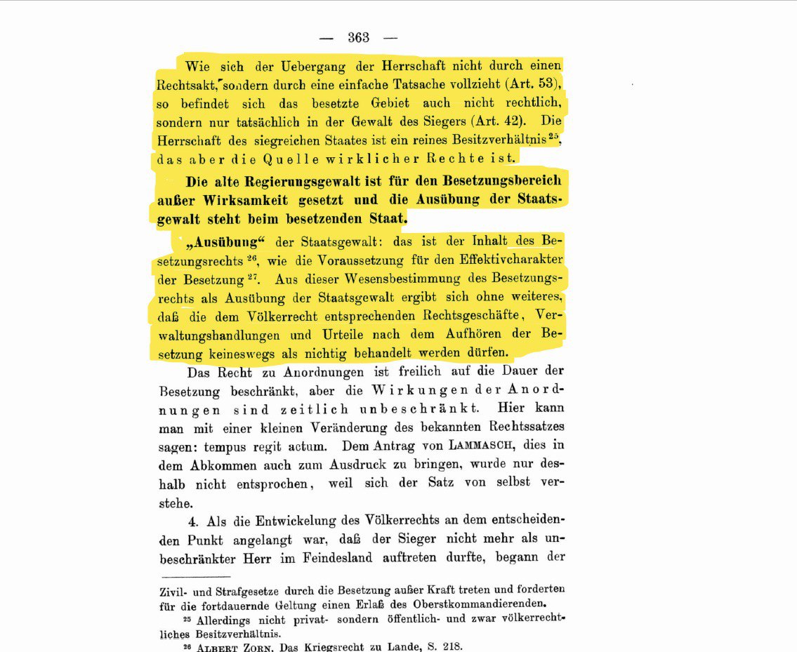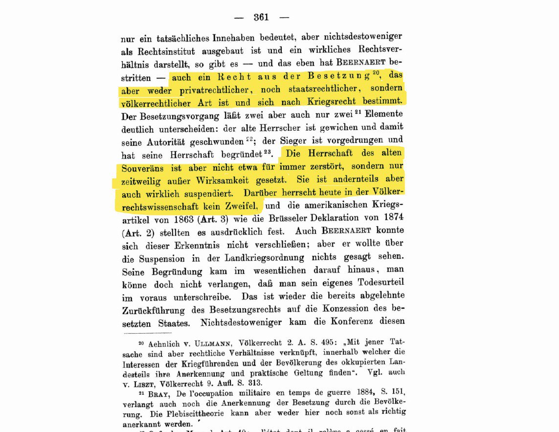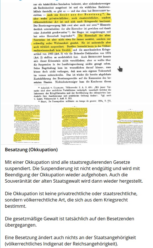 Charakteristisch für die sog. Reichsbürger-Bewegung sollen u.a. Vielschreiberei und krude Rechtsauffassungen sein. Zu diesen kruden Rechtsauffassungen gehört auch die Behauptung, das Deutsche Reich sei seit 1918/ 1919 militärisch besetzt und die Reichsverfassung sei daher auf völkerrechtlicher Grundlage (Okkupation) suspendiert. Um diese Behauptung zu untermauern tauchte jüngst auf Telegram ein Beitrag mit folgenden Auszügen aus einem Buch offenbar juristischer Natur auf (bedauerlicherweise wurde die Quelle nicht genannt):
